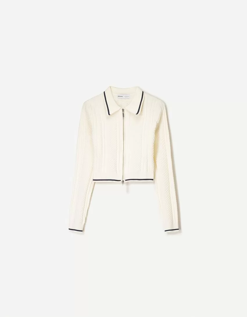 Zip-up jacket with cable-knit polo collar